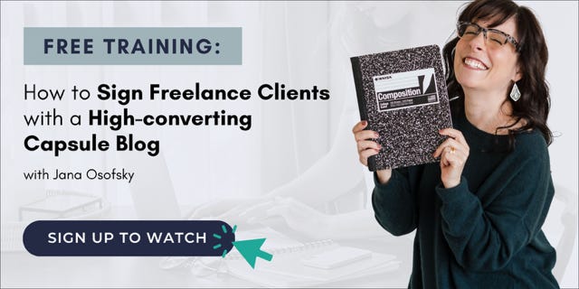 In this free training, content strategist Jana Osofsky teaches you her proprietary capsule blog strategy — 12–20 high-converting evergreen blog posts written to give people exactly what they need, to feel ready to hire you.